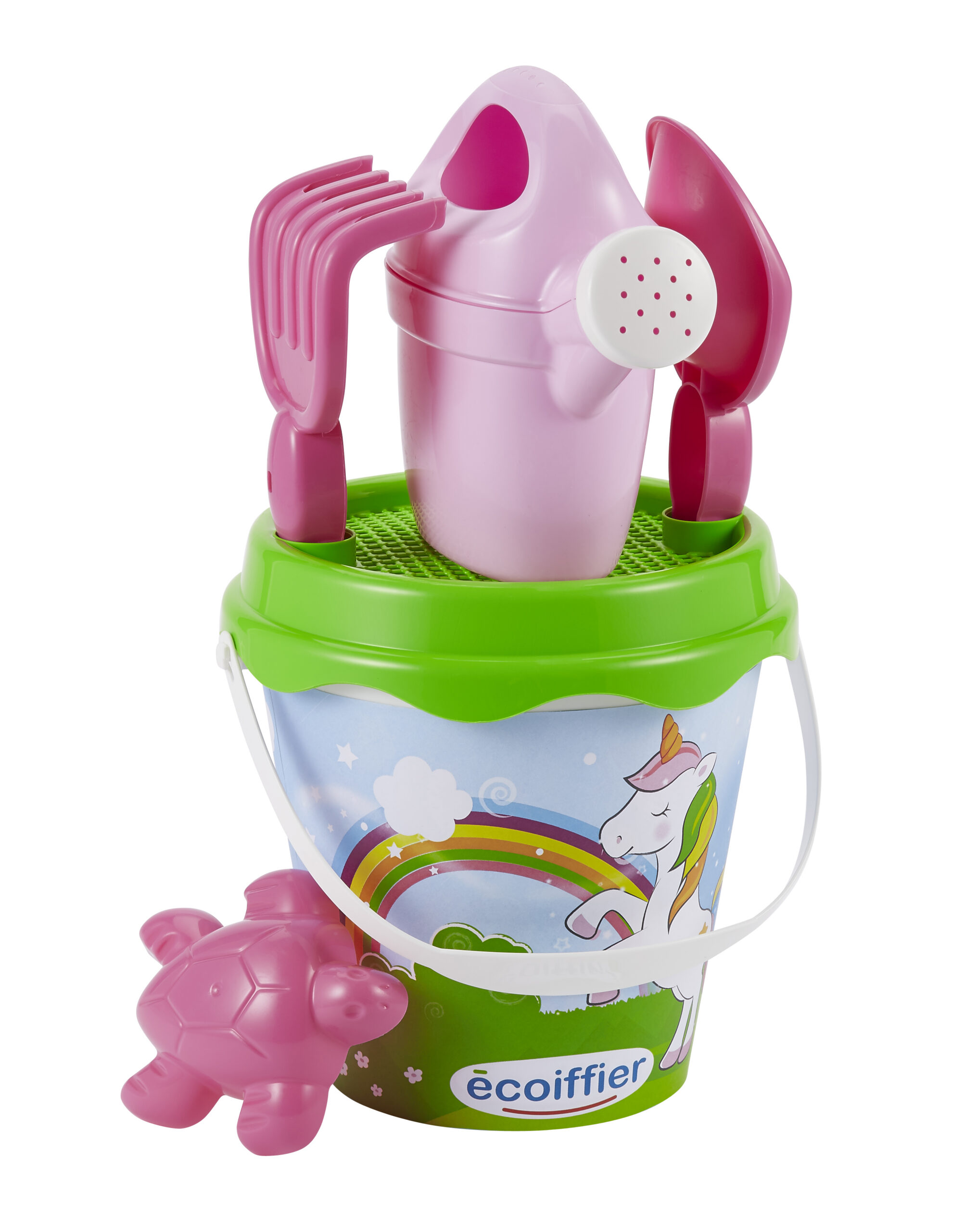 Heledates toonides printsessiteemaline ämbrikomplekt, kus kaasas ka kastekann, reha, kühvel ning kilpkonnakujuline liivavorm.