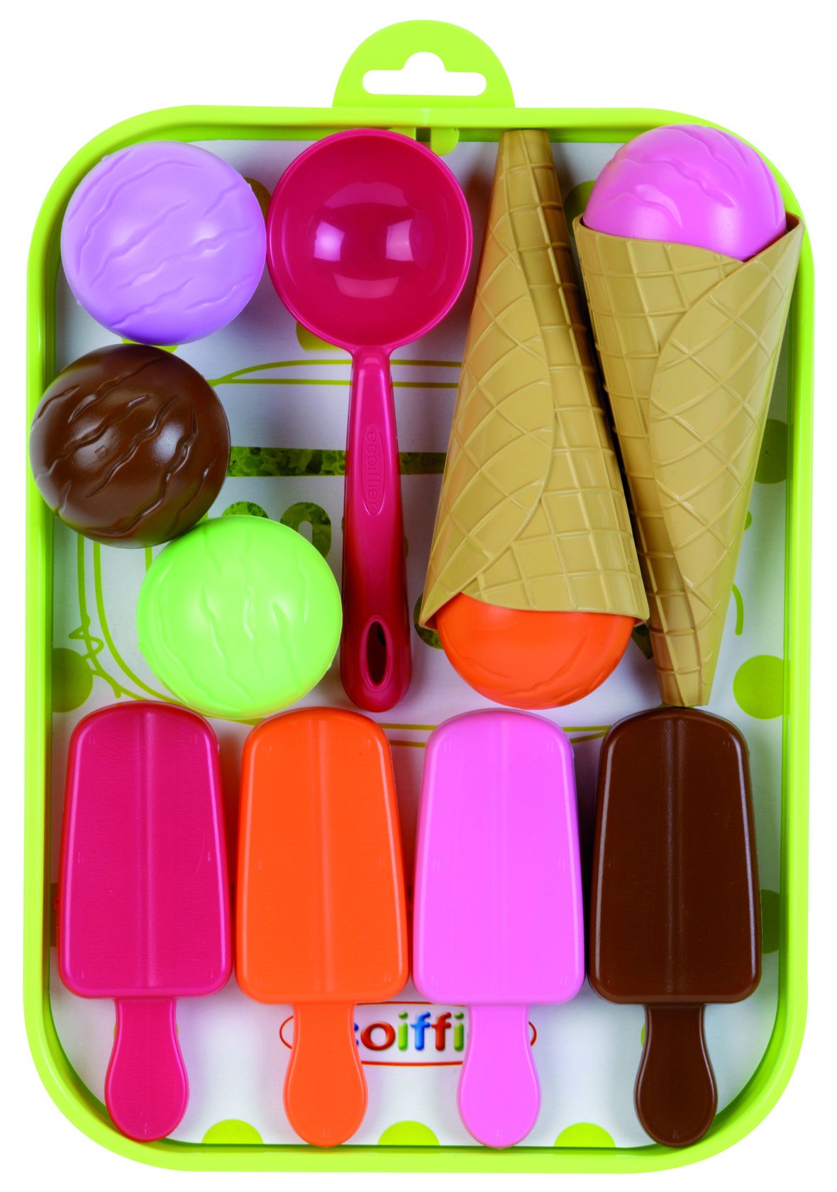 Komplektis on erinevad plastikust jäätised ning kandik.
