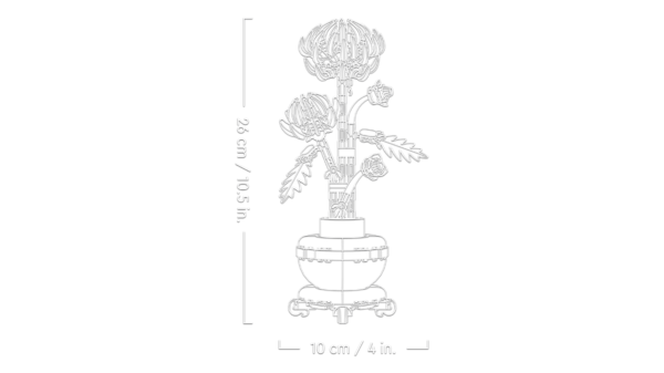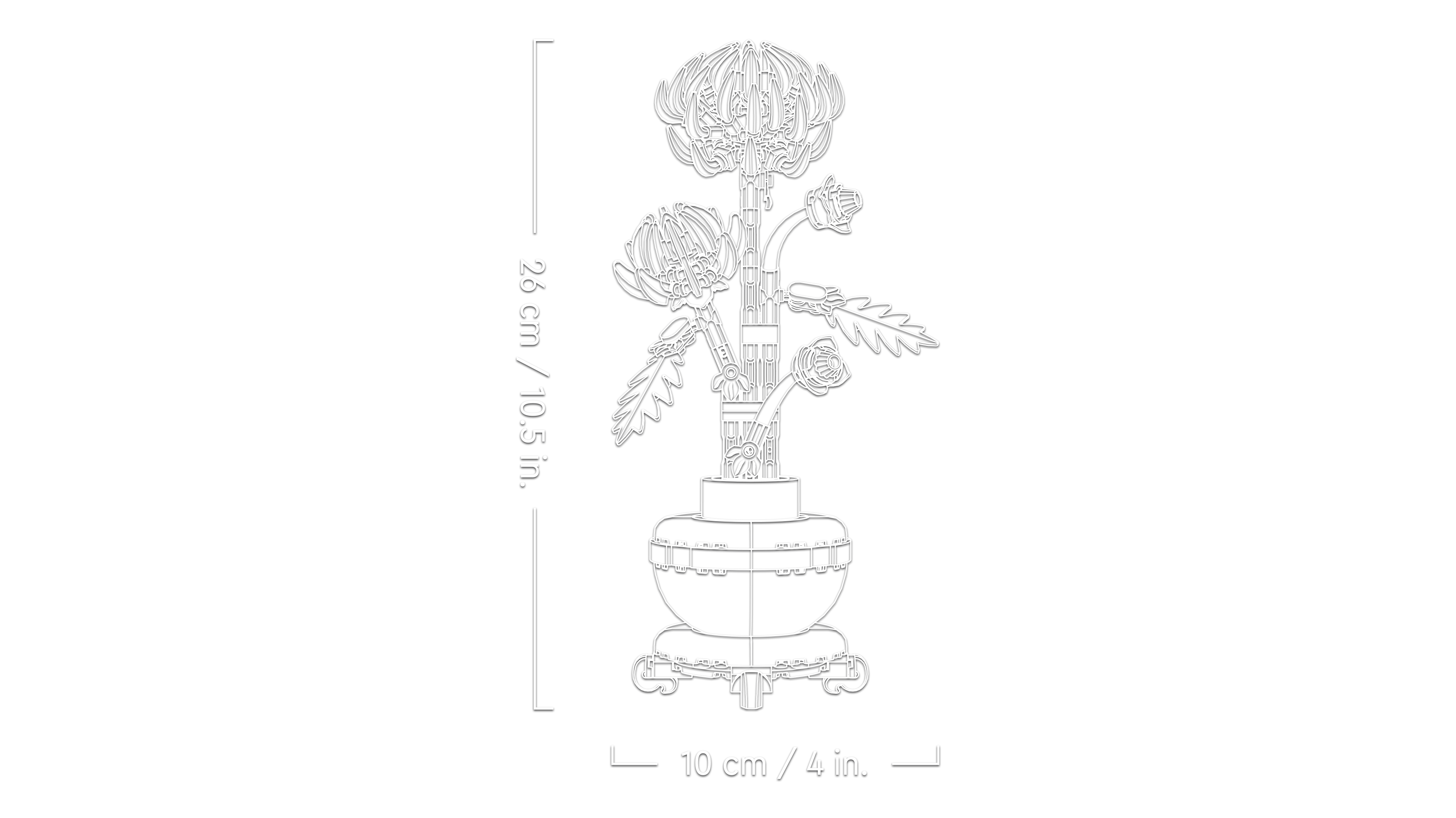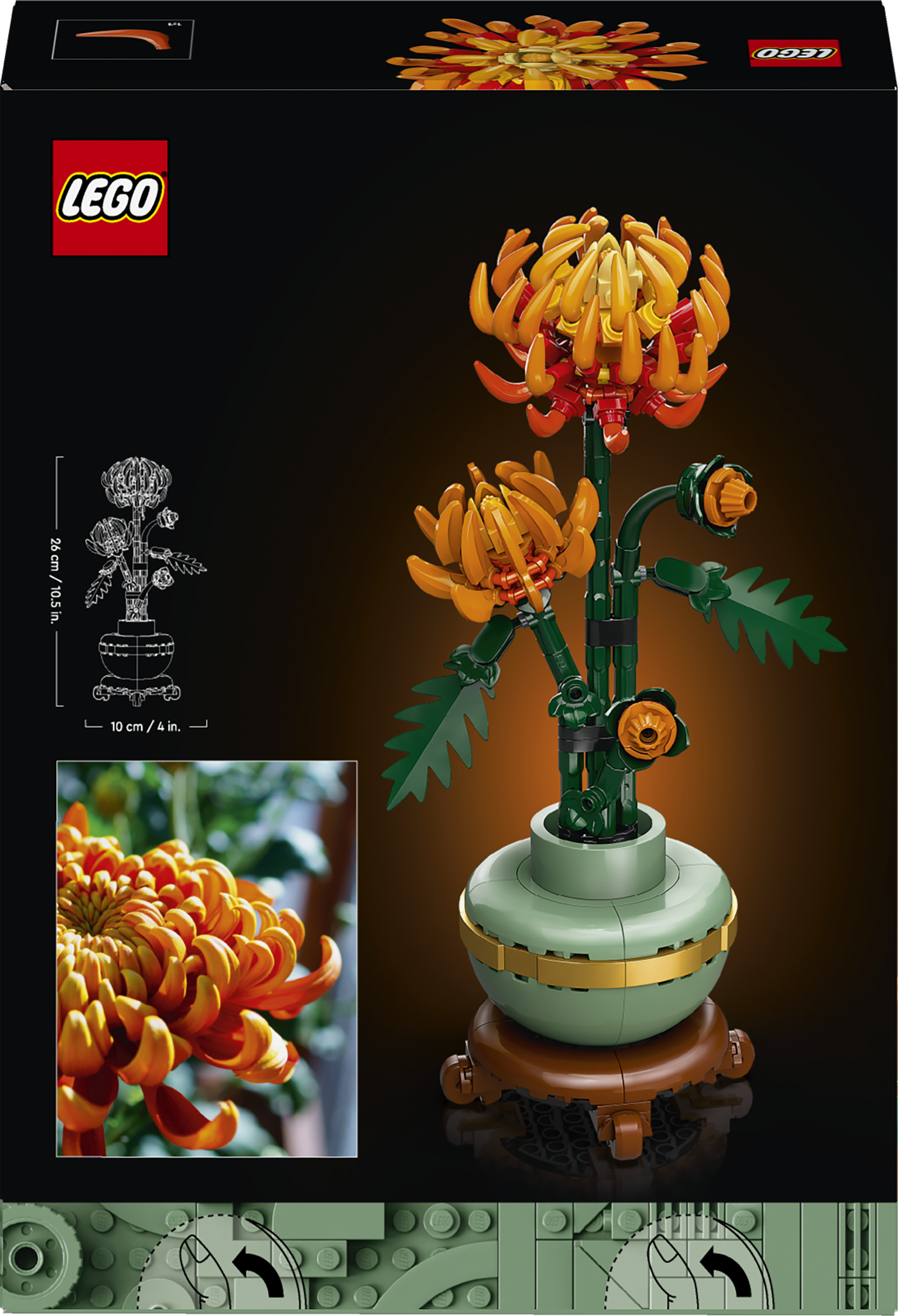 • Mõõdud – selle 278-osalise ehituskomplekti krüsanteem koos poti ja alusega on 26 cm kõrge, 10 cm lai ja 9 cm sügav