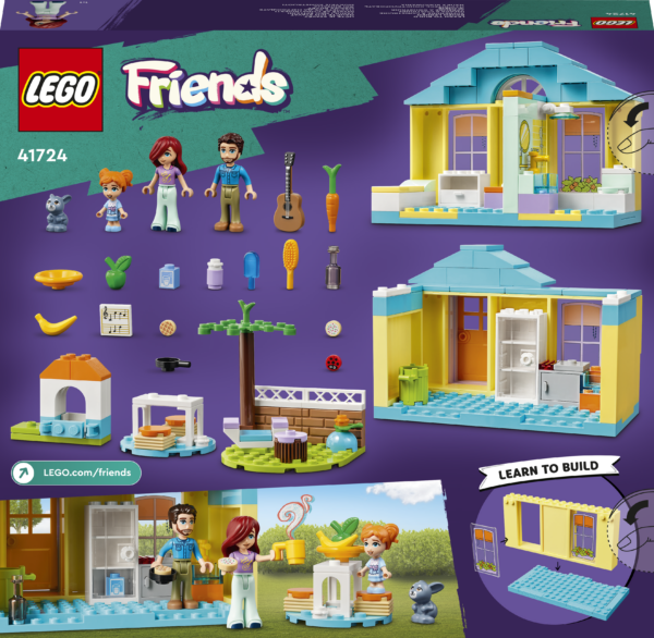 • Sõprusest pakatav maja – selles kahekorruselises LEGO® Friends majas on köök, magamistuba, vannituba, õues asuv söögiala, lisas hubane õuenurk, kus tagasihoidlikule Paisleyle meeldib puhata