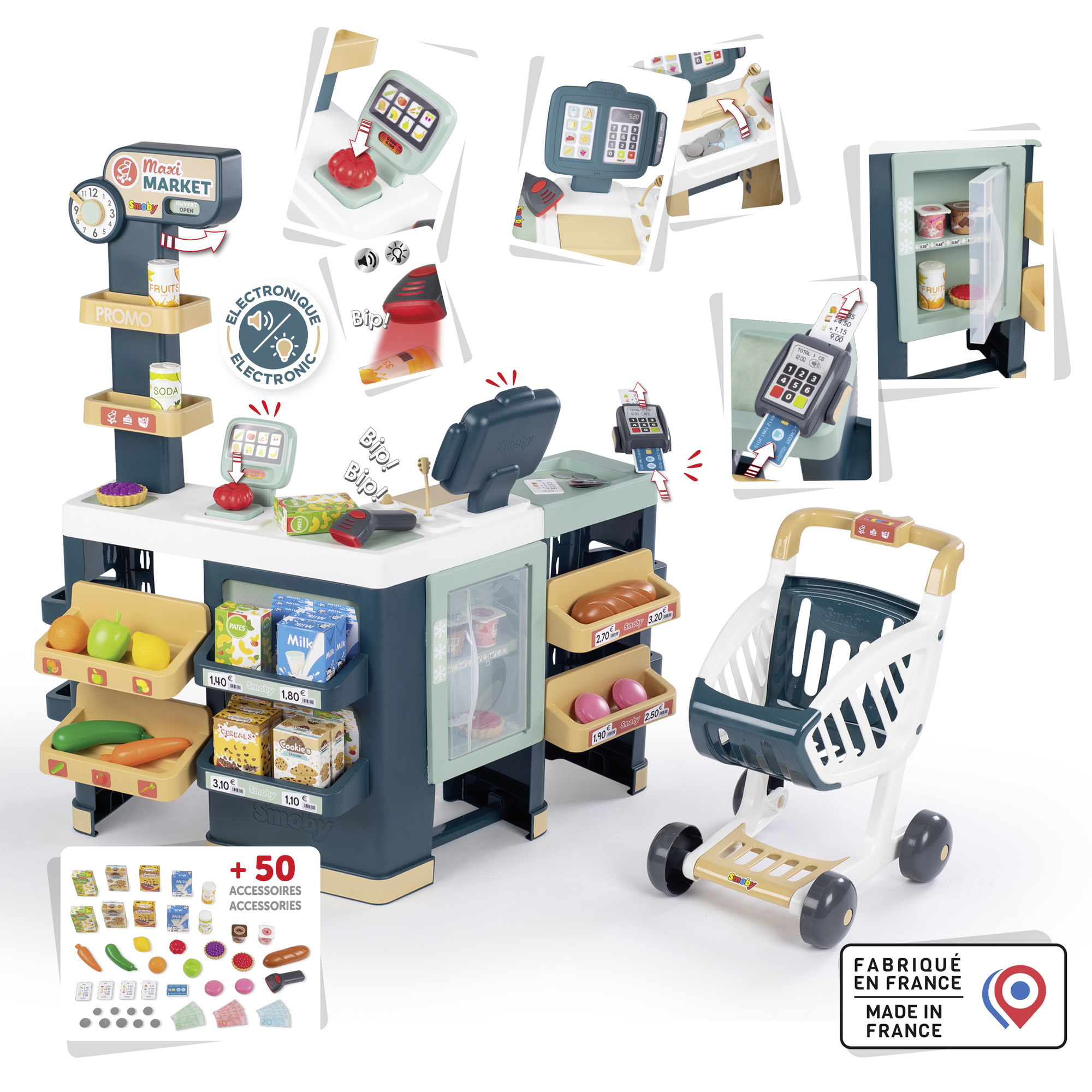 Ehita omale vahva müügikoht! Maksimarketil on selleks kaasas erinevad tarvikud: riiulid, karbid, köögiviljad, puuviljad. Siin on isegi külmkapp, kus pakkuda värskeid tooteid nagu jogurtid või tordid. Kaasas on ka reaalselt töötav kaal, mida kasutada köögiviljade kaalumiseks. Toidukaupu saab skännida vöötkoodilugejaga ja seejärel ostu eest tasuda kassas. Kassaaparaadil on rahasahtel, mikrofon ja krediitkaardilugeja.