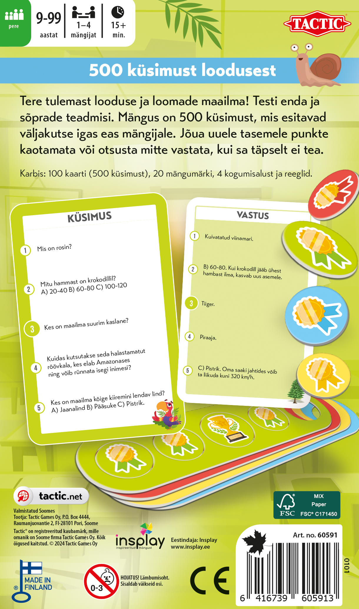 Testi enda ja sõprade teadmisi. Tacticu mälumängus Õpime tundma loodust ja loomi on 500 küsimust, mis esitavad väljakutse igas eas mängijale. Kuidas kutsutakse seda halastamatut röövkala, kes elab Amazonases ning võib rünnata isegi inimesi? Kes on maailma kõige kiiremini lendav lind? Mis on rosin? Jõua uuele tasemele punkte kaotamata või otsusta mitte vastata, kui sa täpselt ei tea.