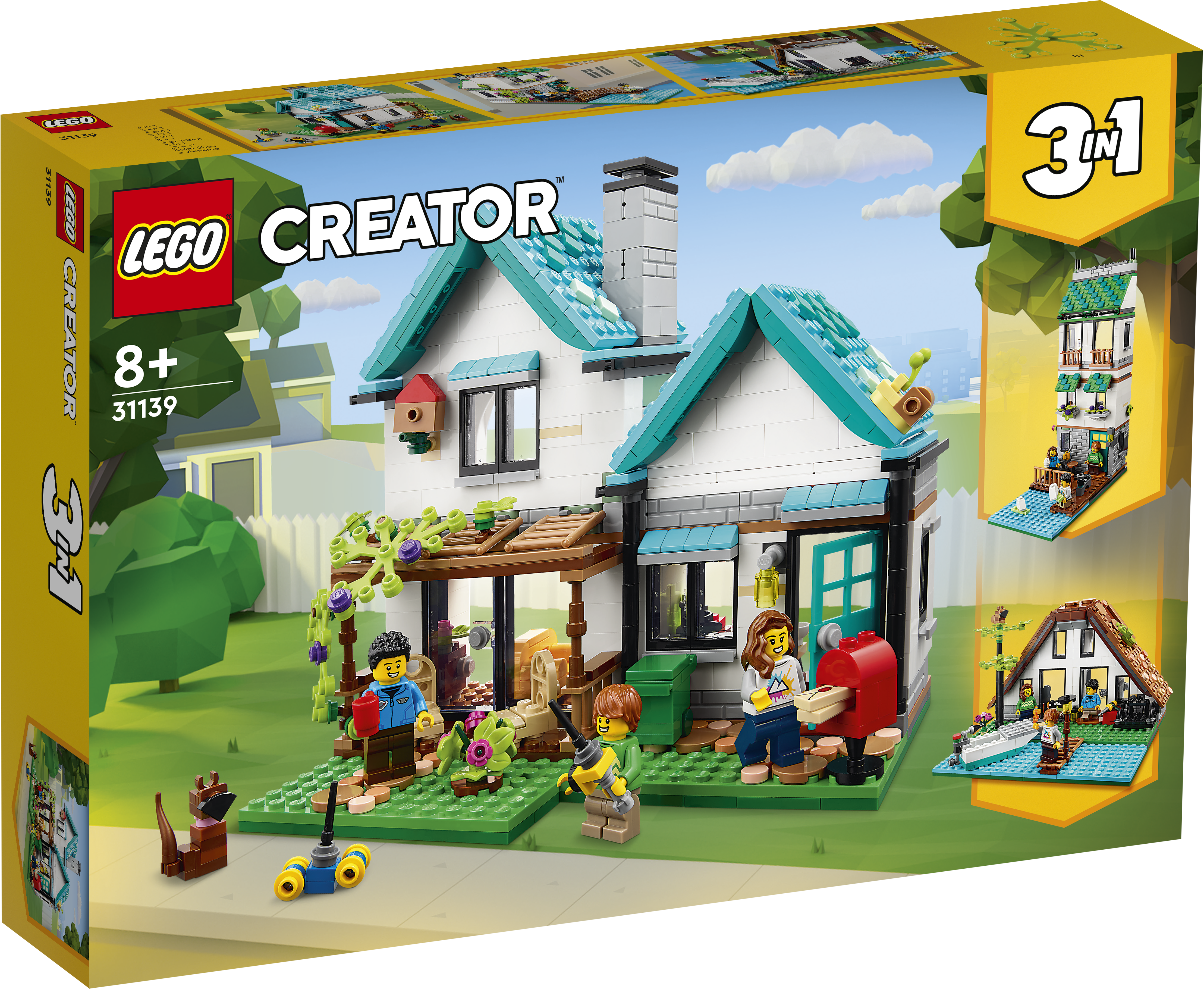 • Kolm-ühes majamudelid – lapsed saavad selle LEGO® Creator 3in1 hubase maja (31139) mängukomplektiga mängida rollimänge lõbusates perelugudes; komplektis on kolm mudelit: peremaja, kanalimaja ja järvemaja
