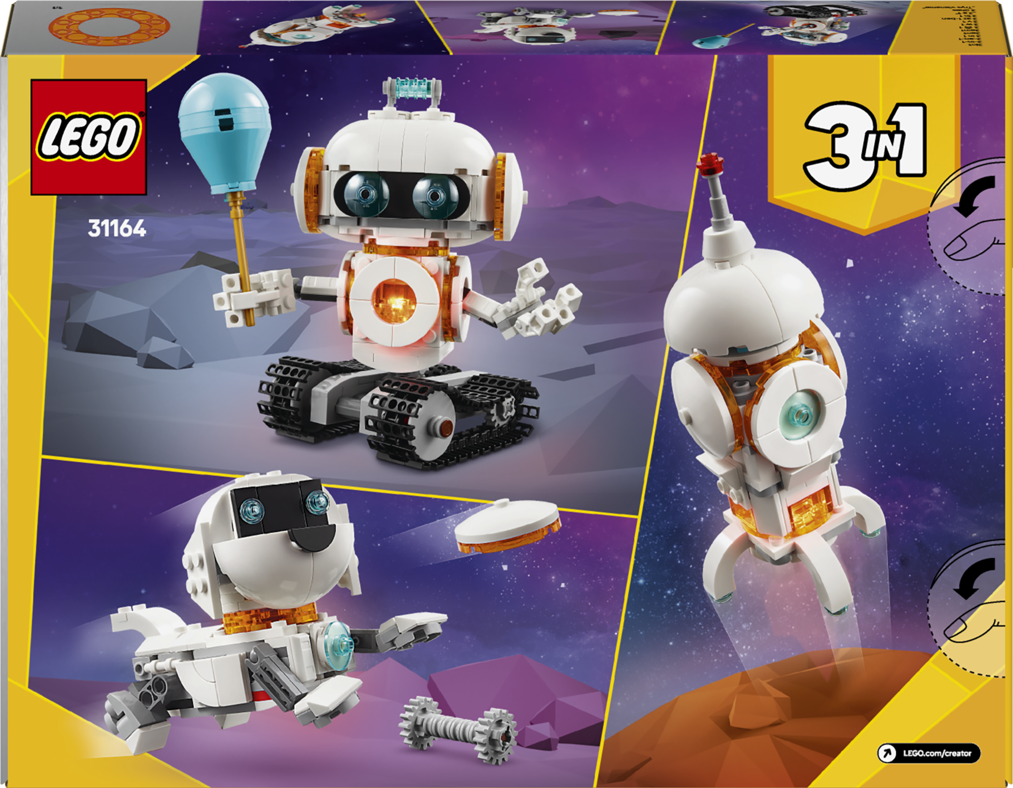 • Kolm kosmosemänguasja ühes karbis – komplekt LEGO® Creator 3-ühes Kosmoserobot võimaldab alates 8-aastastel poistel ja tüdrukutel ehitada ja ümber ehitada kolm erinevat mänguasja samade klotsidega