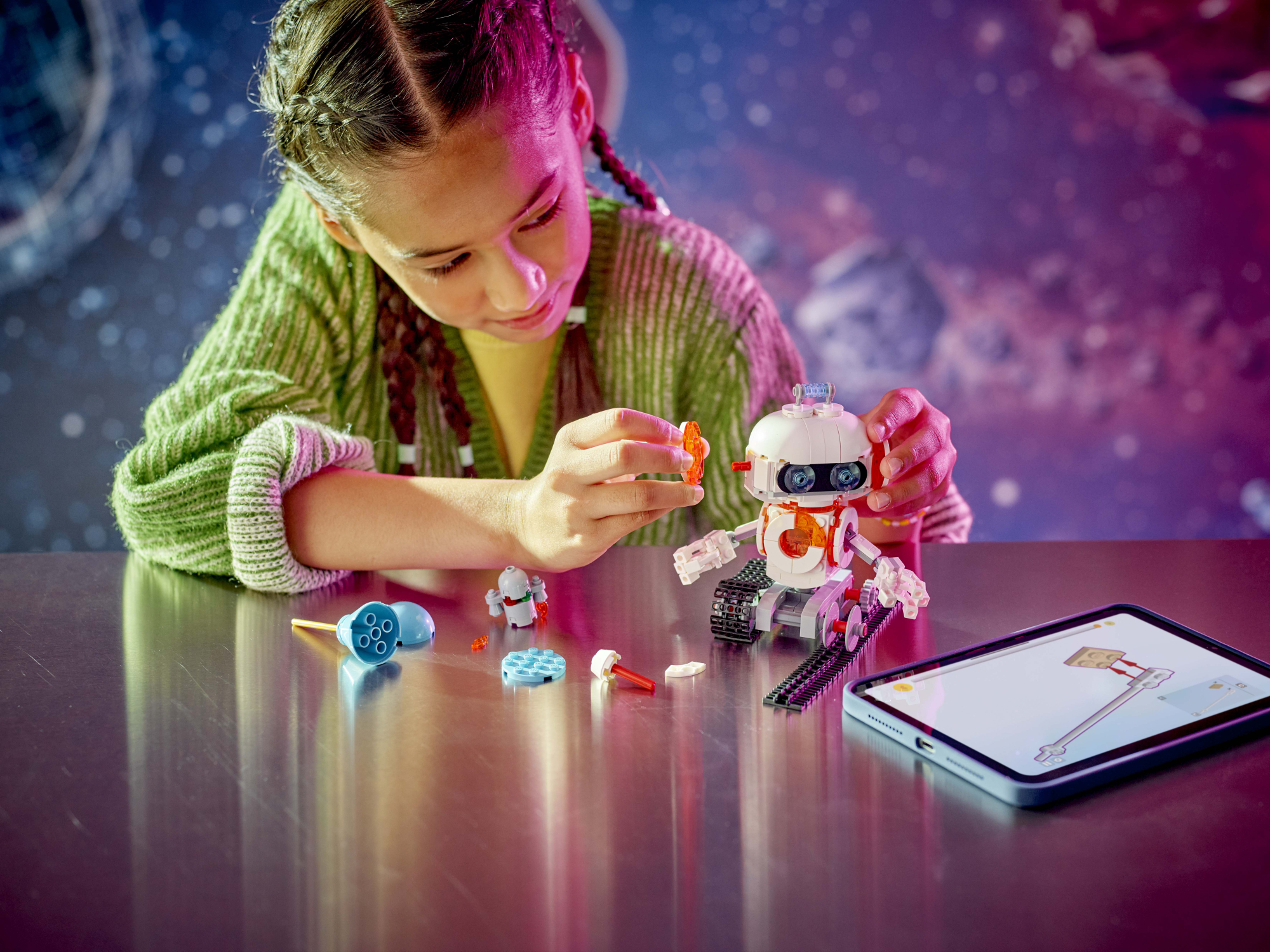 • Valgustatud mudelid – kõik kolm LEGO® kosmosemudelit süttivad, kui lapsed vajutavad spetsiaalsele valgusklotsile (patareid kaasas)