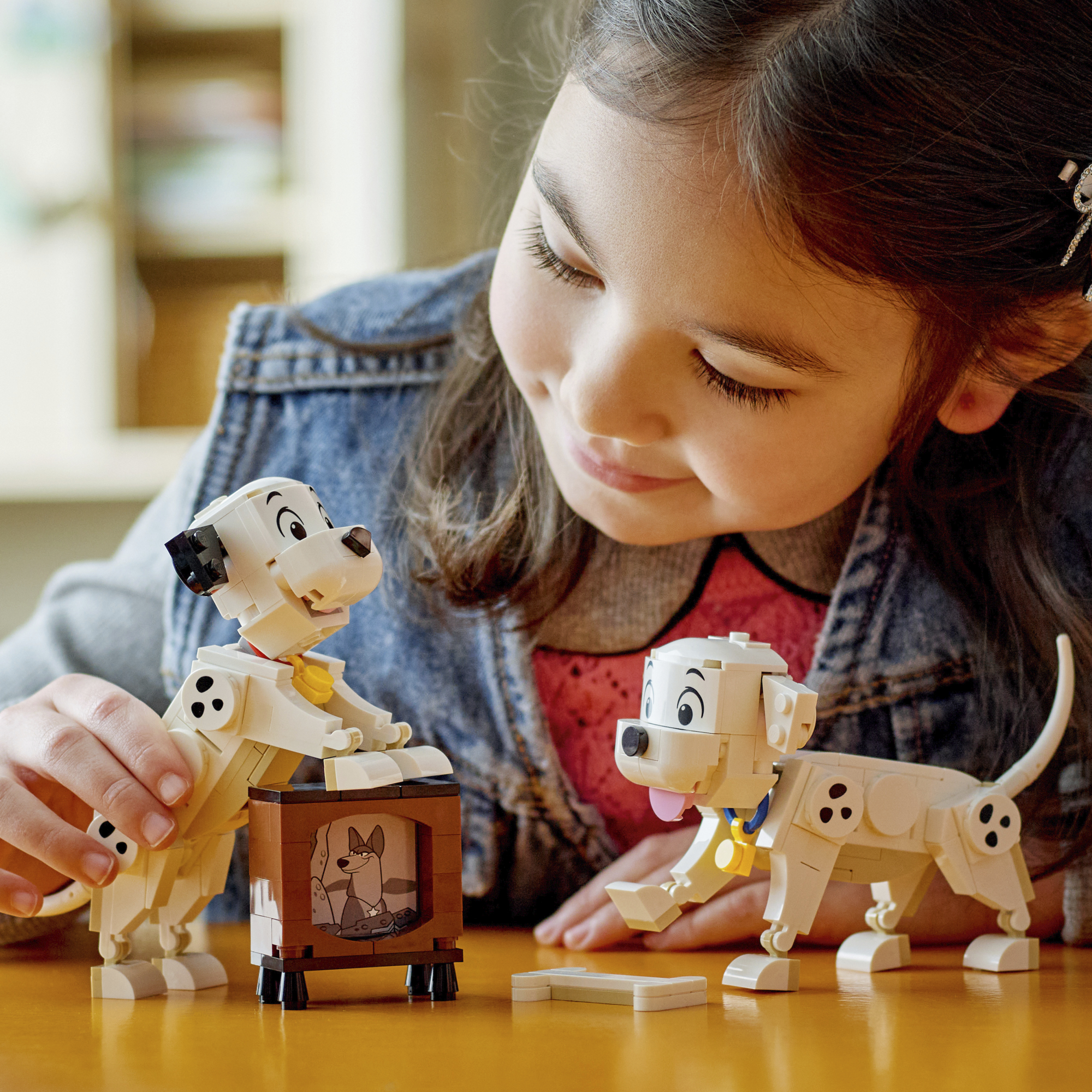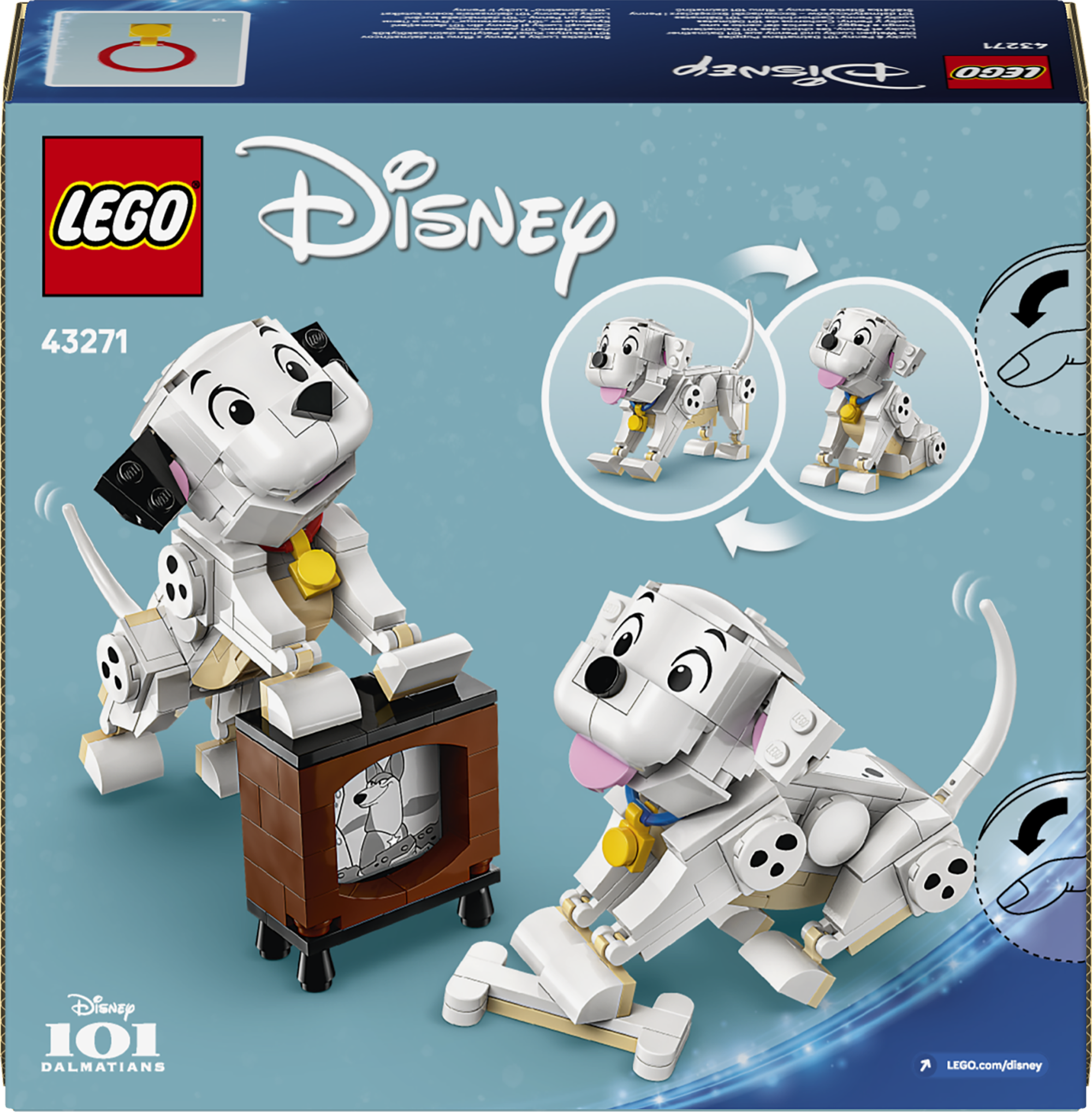 • Dalmaatsia koerte kutsikad kõikjal – selles laste ehitusmänguasjas on Lucky ja Penny LEGO® ǀ Disney tegelased klassikalisest filmist 101 dalmaatsia koera, lisaks klotsidest ehitatud kont ja väike ekraaniga televiisor