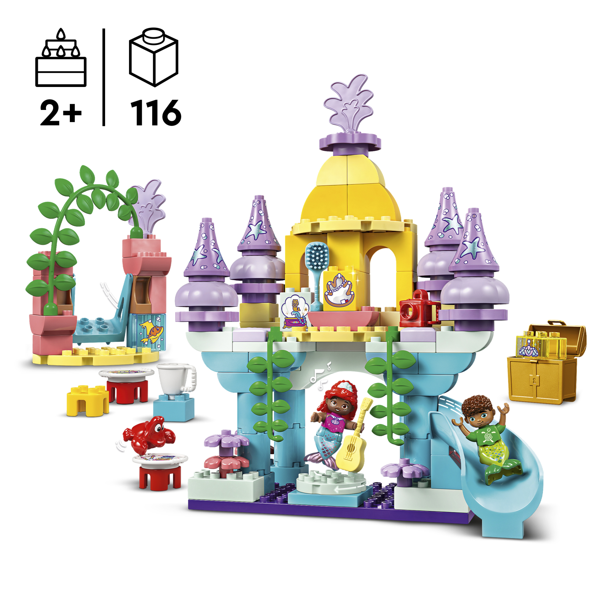 • Kokkupandav mänguloss, mis on koduks Väikesele merineitsile Arielile – väikelapsed saavad komplektiga LEGO® DUPLO® ǀ Disney Arieli maagiline veealune palee nautida veealust ehitusmängu