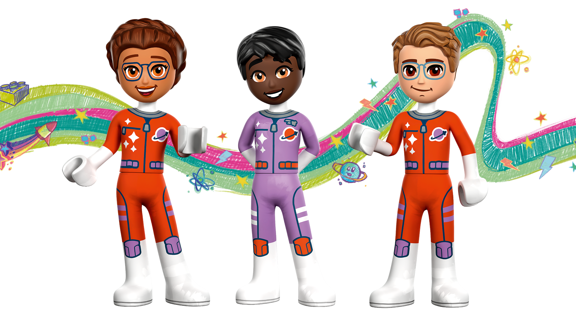 • Kolm mininukku ja kass – see laste mängukomplekt sisaldab Oliviat ja Juliani, klassikalisi LEGO® Friends tegelasi, kes on suureks kasvanud ja saanud astronautideks, lisaks missiooni ülemat Avelineʼi ja kosmosekassi figuuri