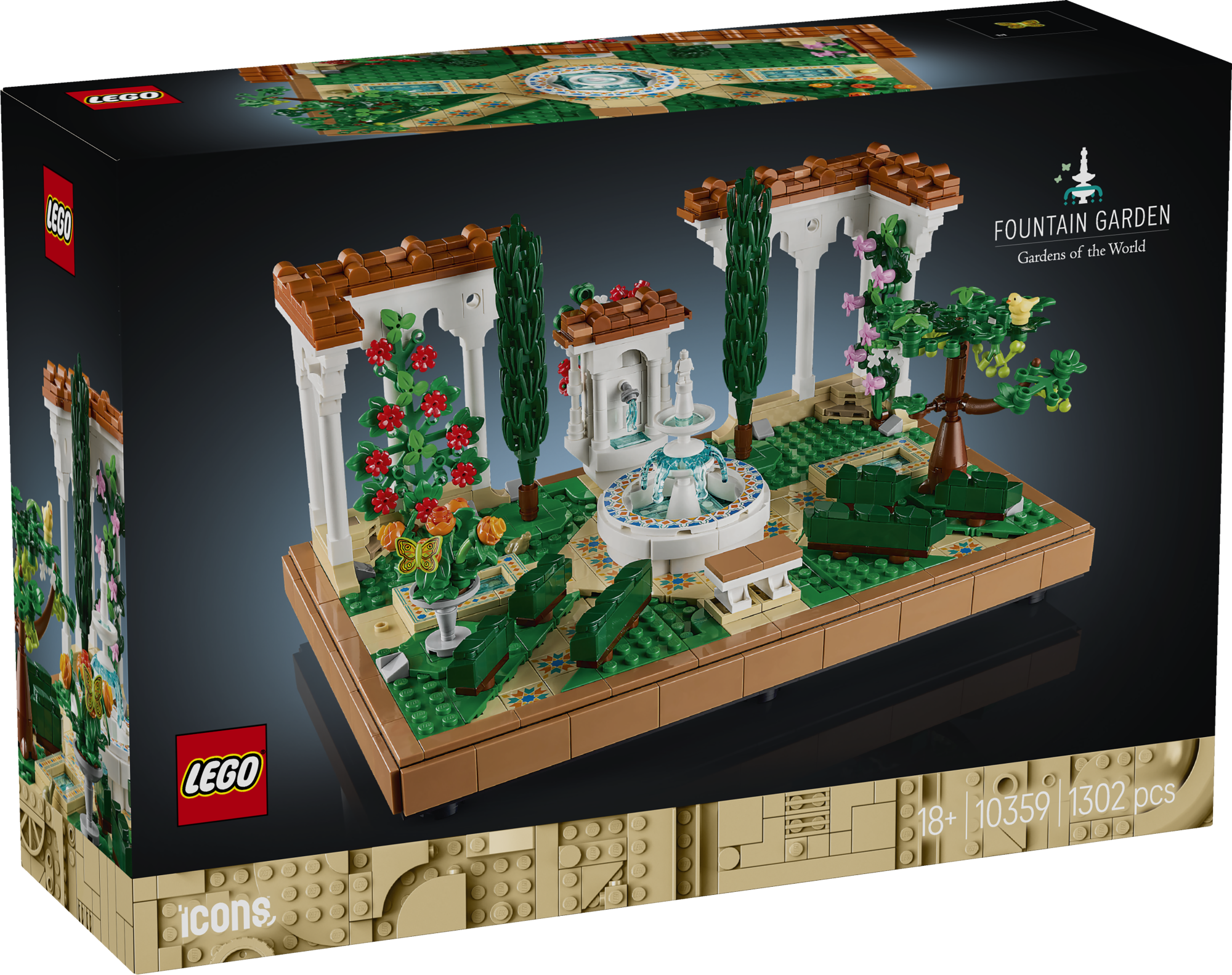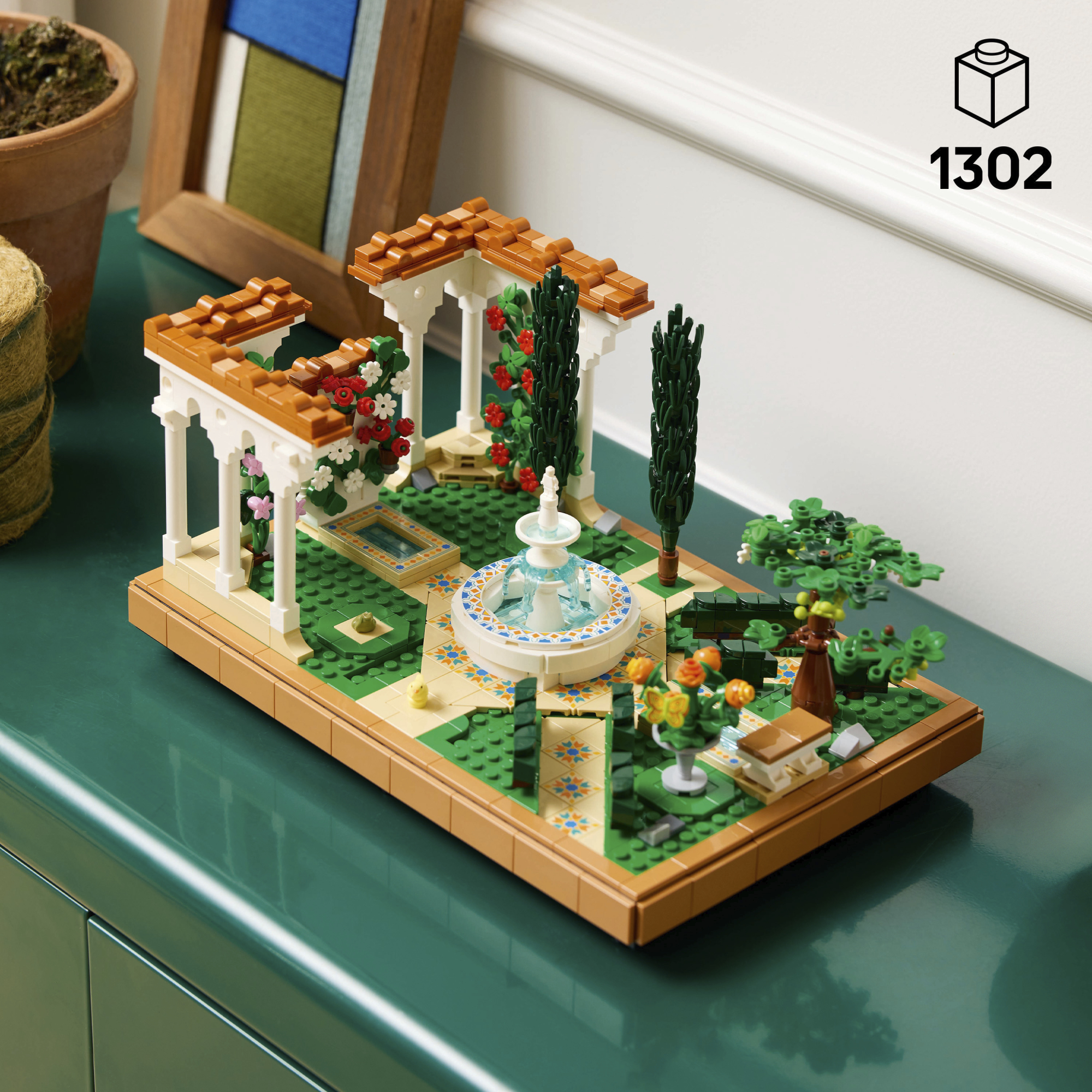 Loo kodus või kontoris kaunis väljapanek LEGO® Icons Purskkaevude aia ehituskomplektiga täiskasvanutele.