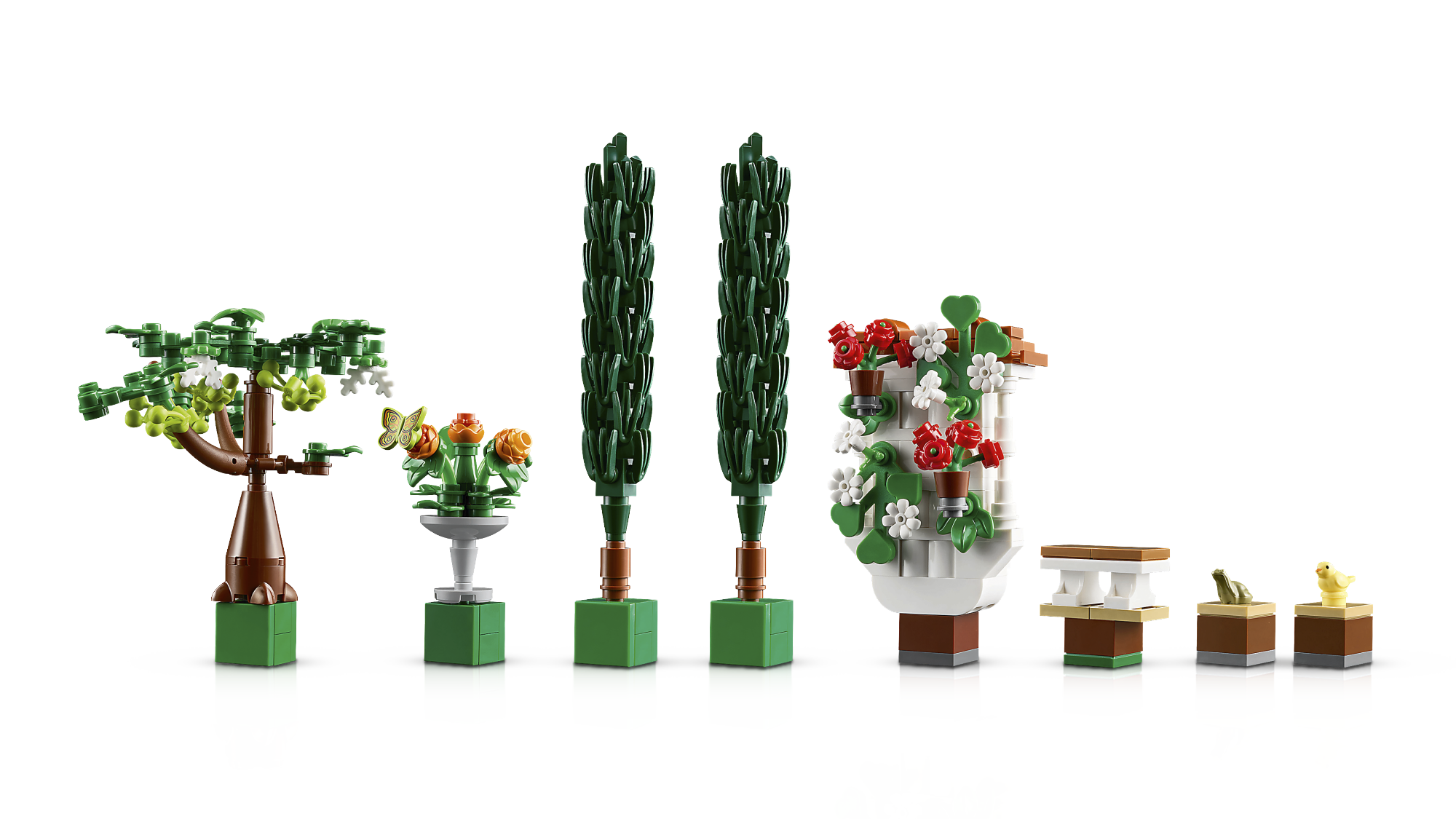 • Mis on karbis – LEGO® Purskkaevude aias on mitmetasandiline purskkaev, kivist valamu, 2 küpressi, õitsevad viinapuud, 4 lehtlat ja plaaditud rada, lisaks kuuliblikas, linnu- ja konnafiguur