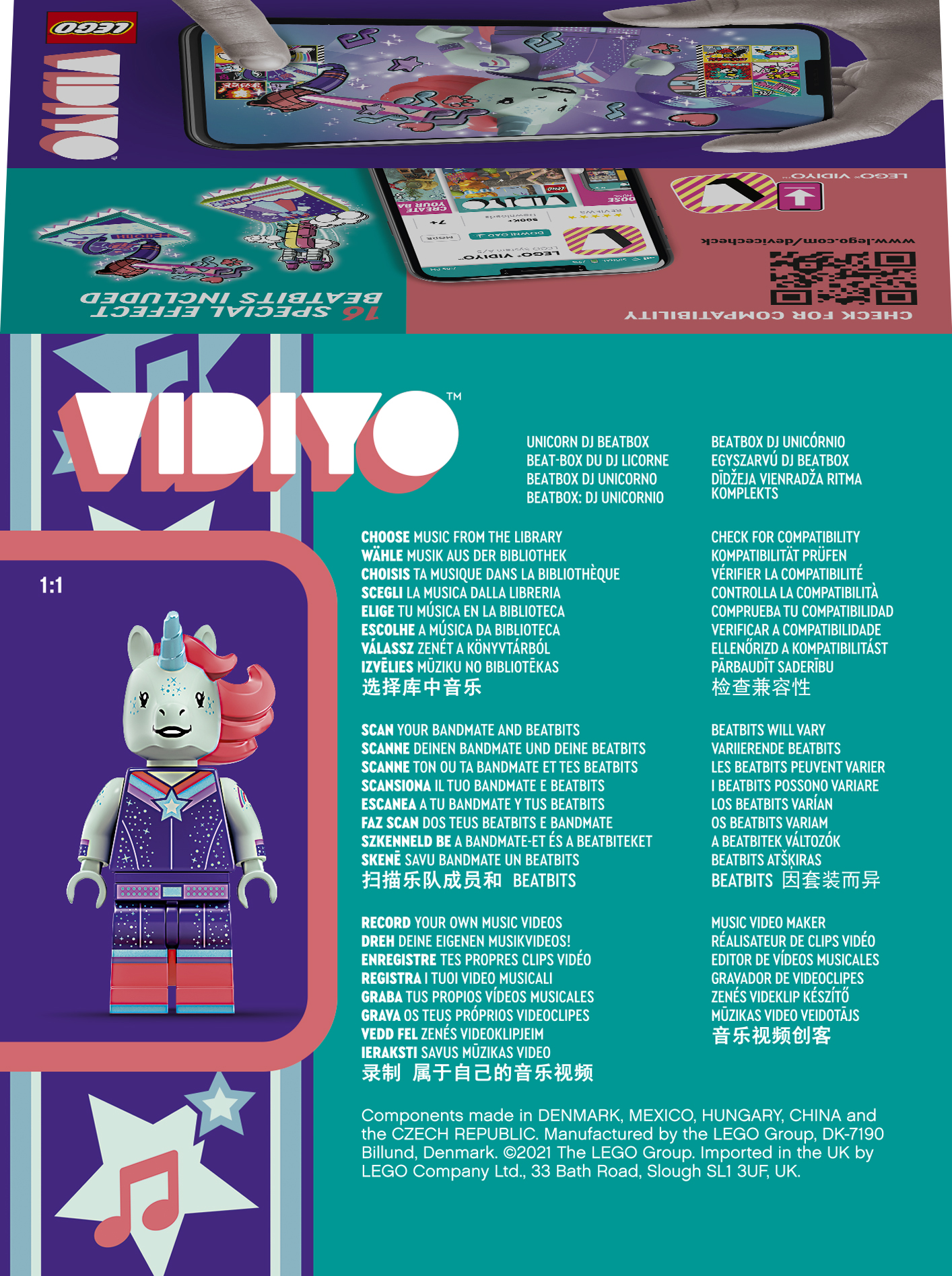 • Vaata, kuidas lapsed lavastavad oma muusikavideoid ja mängivad nendes peaosa LEGO® VIDIYO™ Unicorn DJ BeatBoxi (43106) abil. Komplektis on ükssarvikust DJ minifiguur, vinüülplaat, 14 juhuslikku BeatBiti ja kaks erilist BeatBiti. • Laadi alla tasuta rakendus LEGO® VIDIYO™, et skannida minifiguuri ja eriefektidega BeatBite. Lastel on põnev vaadata, kuidas nende tegelane ärkab muusikavideos ellu. • Skanni rakenduses BeatBite, et avada eriefekte, nt efekt, mis lisab lauludele armsa sündipopi heli. • Vahva muusikalahendus vähemalt 7-aastasele poisile või tüdrukule, kes väärib preemiat. See mängukomplekt on ka suurepärane pühadekingitus lapsele, kes armastab muusikamänguasju, tantsimist ja esinemist. • BeatBox on 8 cm kõrgune, 7 cm pikkune ja 10 cm laiune. • BeatBox käib kokku, et lapsed saaksid oma muusikalise maailma endaga igale poole kaasa võtta. BeatBoxis on ruumi klotsidest ehitatud lava, 16 BeatBiti ja vinüülplaadi jaoks. • LEGO® VIDIYO™ rakendus ühildub valitud iOS-i ja Androidi seadmetega. Teavet ühilduvuse kohta leiad veebilehelt www.LEGO.com/devicecheck. Lapsed peaksid küsima interneti kasutamiseks oma vanematelt luba. • LEGO® VIDIYO™ komplektid pakuvad uut seltskonnamänguelamust, kus poisid ja tüdrukud saavad olla lavastajad, produtsendid ja muusikatähed, lavastades ning jagades oma muusikavideoid. • LEGO® detailid vastavad tööstusharu rangetele nõuetele, et tagada nende stabiilne kvaliteet, ühtesobivus ja kindel ühendatavus alati. Nii on see olnud aastast 1958. • LEGO® osi kukutatakse, kuumutatakse, muljutakse, väänatakse ja analüüsitakse. Nii võid kindel olla, et need vastavad rangetele üleilmsetele ohutusstandarditele.