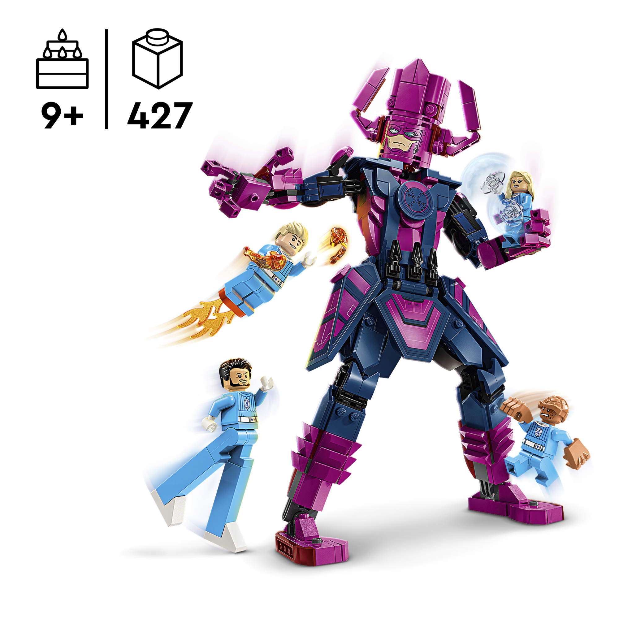 • 427-osaline ehituskomplekt – täielikult liigendatud Galactuse ehitusfiguur on 28 cm pikk
