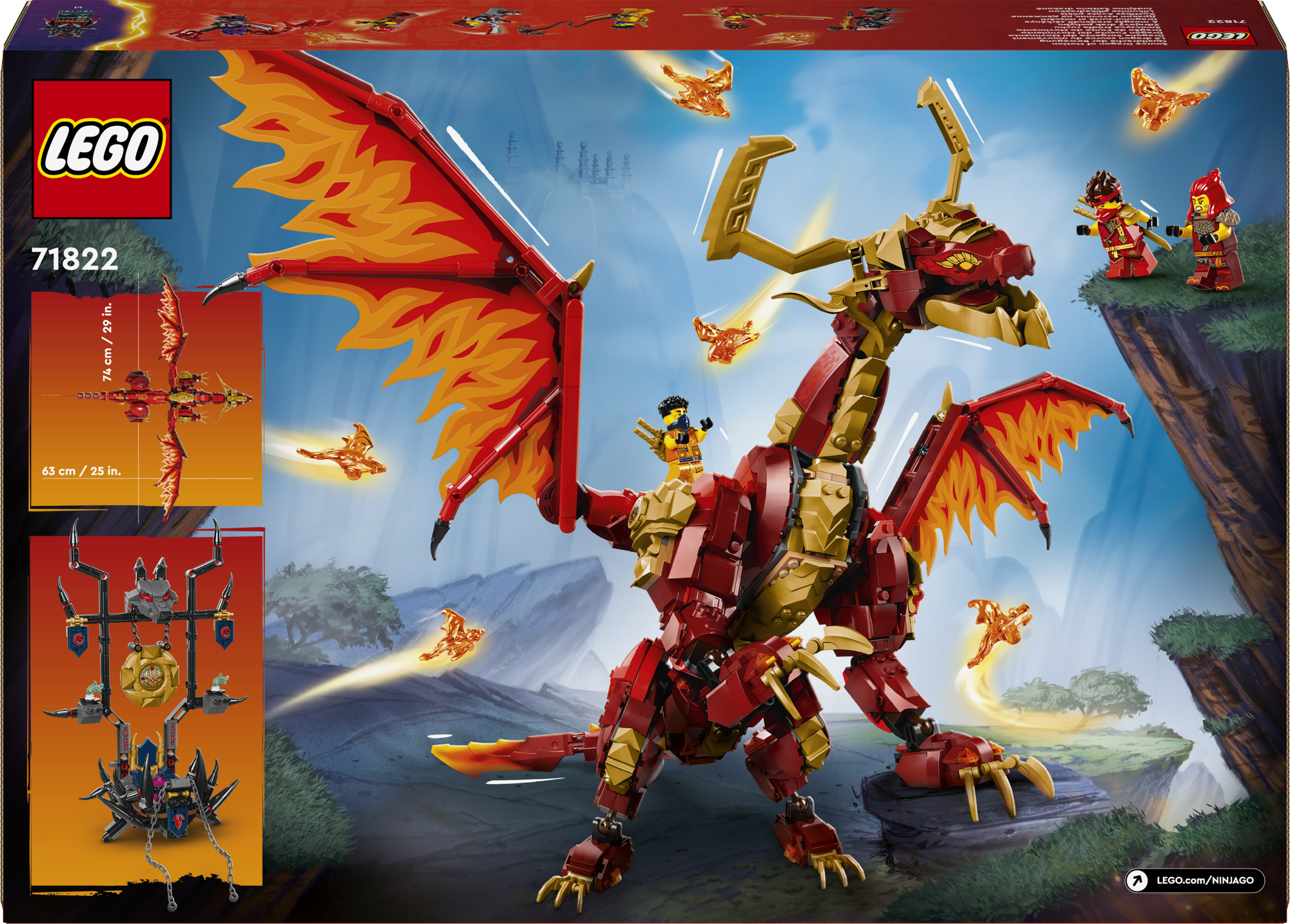 • Muudetava asendiga NINJAGO® draakon – kõigi aegade suurimal NINJAGO draakonil on muudetava asendiga jalad, saba, puusad, lõualuu, pea, kael ja suured tiivad rollimänguseiklusteks