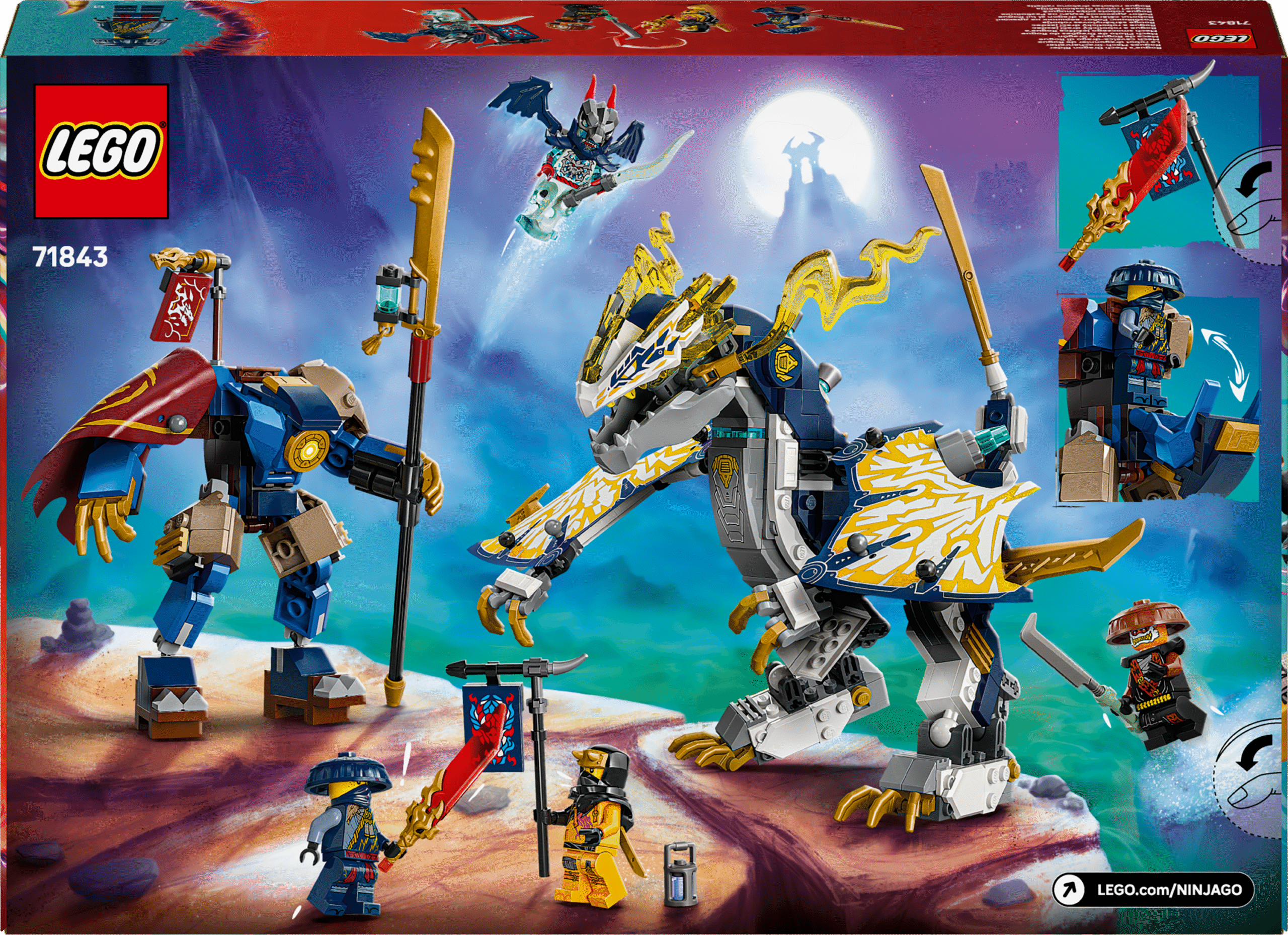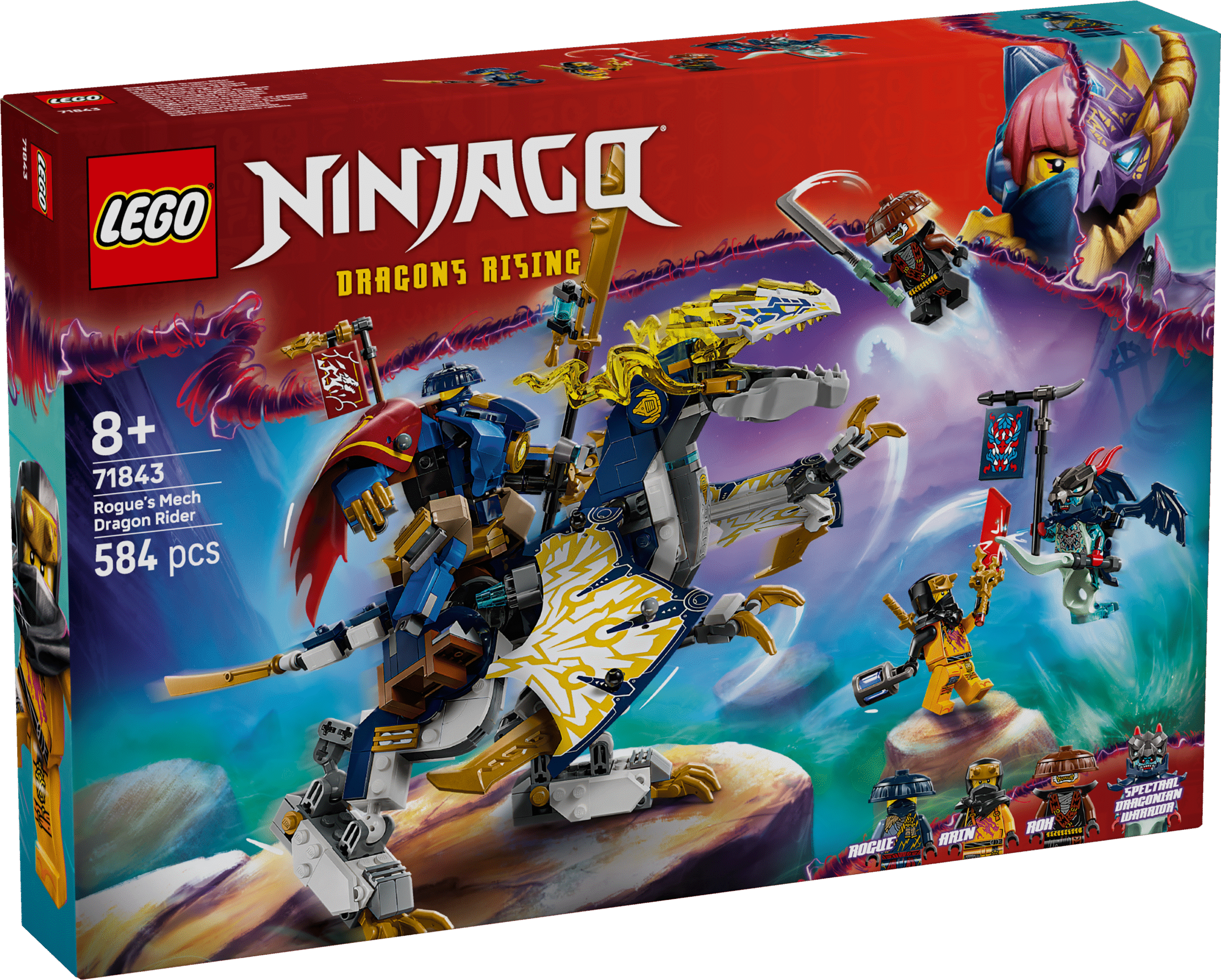 • Ninjamänguasi lastele – 8-aastased ja vanemad poisid ja tüdrukud saavad etendada lahingustseene 3. hooajast sarjast NINJAGO® Dragons Rising selle Rogue’i roboti draakonisõitja seiklusmänguasjaga