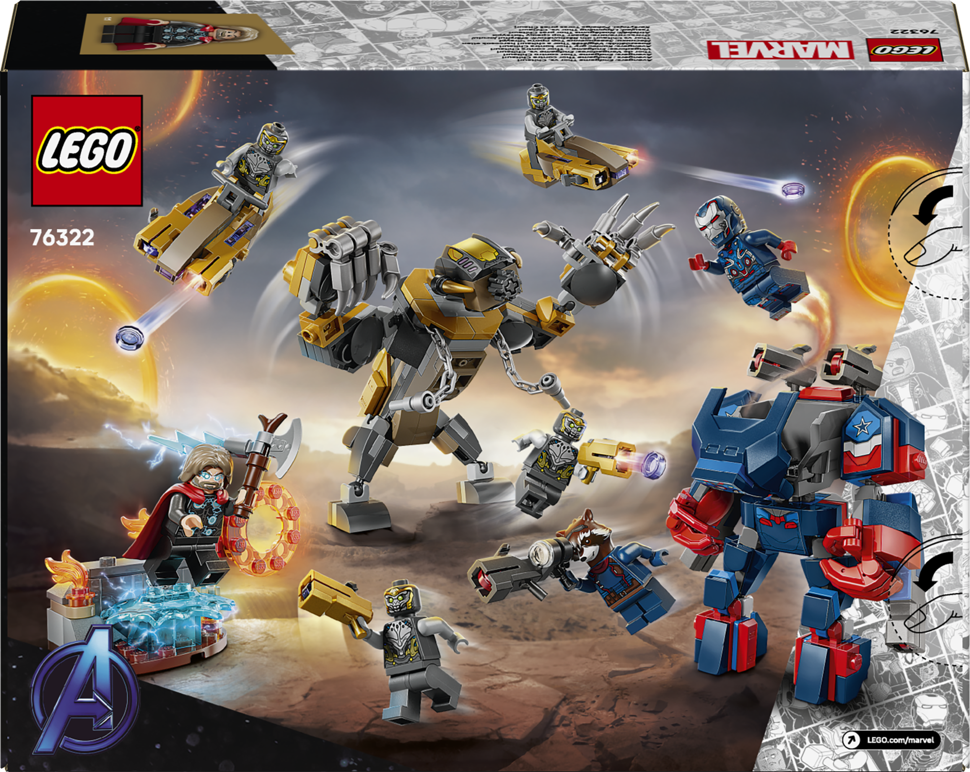 • LEGO® ǀ Marvel minifiguurid – seal on 7 minifiguuri: Iron Patriot MK2; suure nupsukahuriga Rocket; Thor koos Stormbreakeriga; ja 4 Chitaurit, millest kahel on kuldsed nupsukahurid