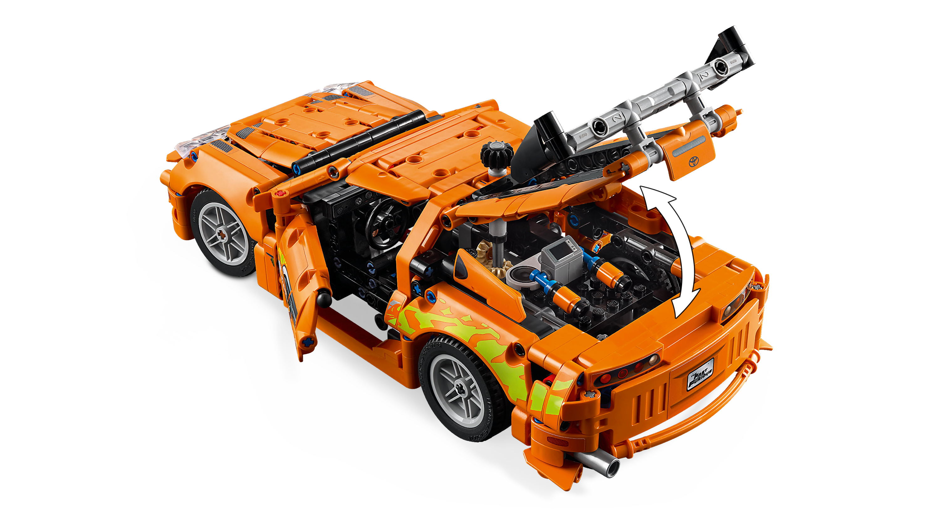 Selles autokomplektis on kokkupandav LEGO Technicu Fast and Furious Toyota Supra MK4 millel on 6-silindriline mootor, rool, avatav kapott ja 2 NOSi pudelit