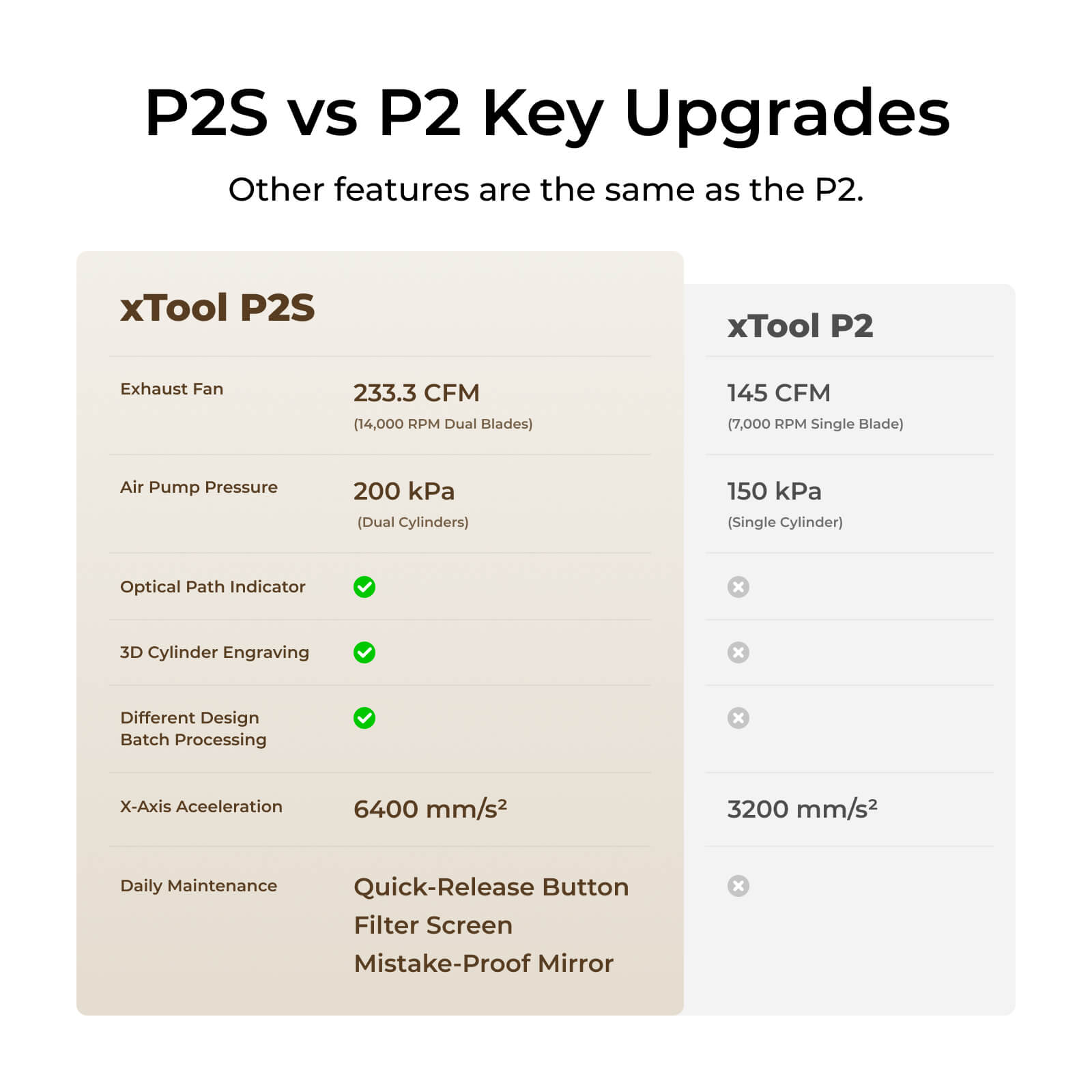 * Võimas lõikejõudlus. xTool P2S lõikab ühe korraga kuni 20 mm akrüüli ja 18 mm puitu, olles 500% kiirem kui 40 W dioodlaserid. See võimaldab kiiresti realiseerida suuri projekte, näiteks mööblidetaile või prototüüpe.