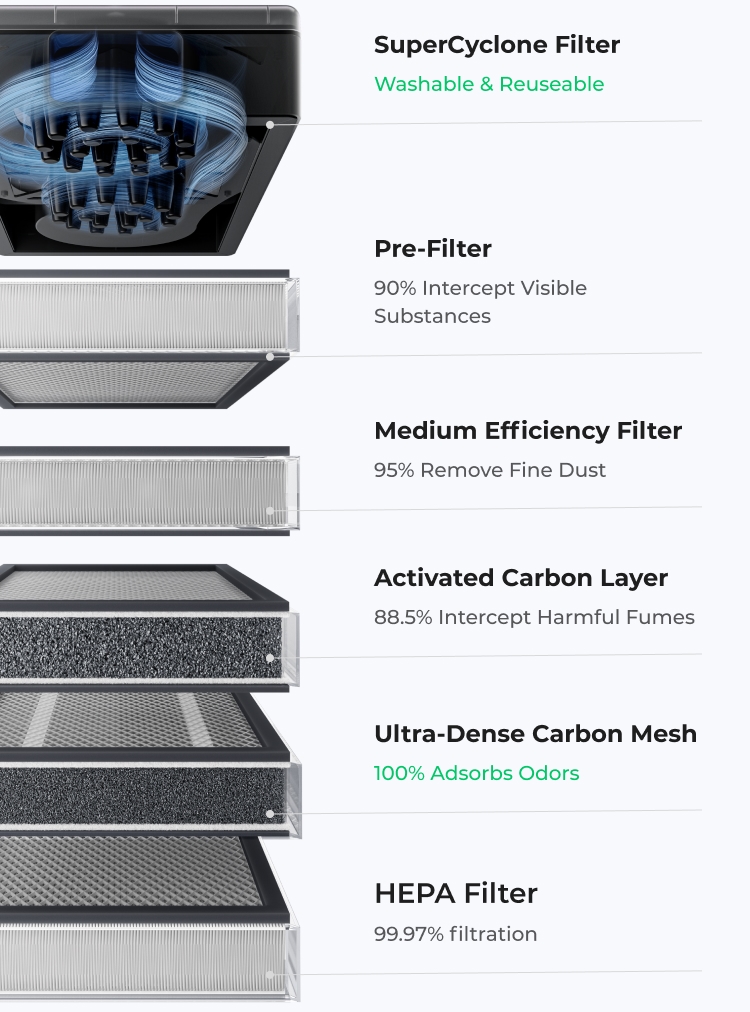 Püüa kinni ka kõige väiksemad aurud ja kangekaelsemad lõhnad professionaalse filtreerimiskihiga, mis toob laboritasemel õhukvaliteedi sinu töökeskkonda.